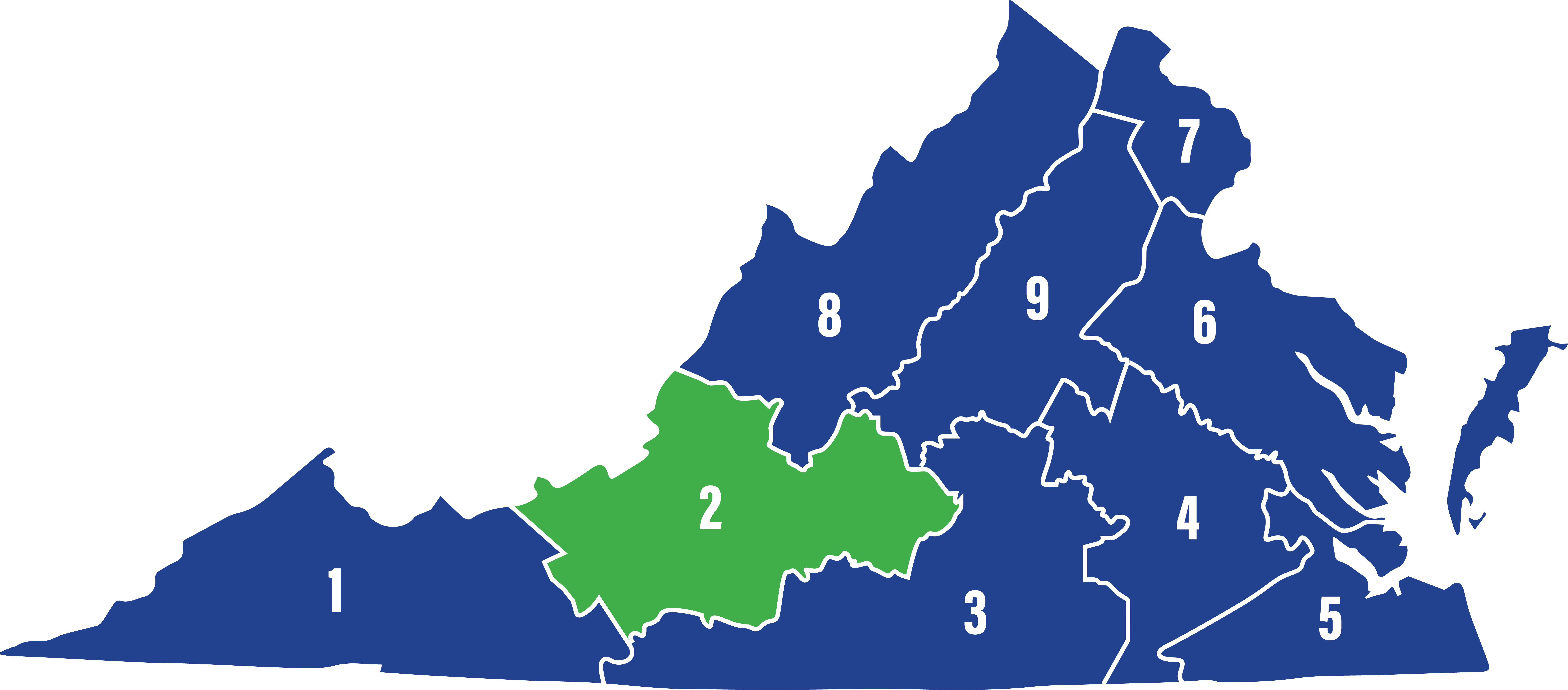 第二区包括阿勒格尼县、阿默斯特县、阿波马托克斯县、贝德福德县、博特托克斯县、坎贝尔县、克雷格县、弗洛伊德县、富兰克林县、贾尔斯县、蒙哥马利县、普拉斯基县和罗阿诺克县,以及卡温顿县、林奇堡县、拉德福德县、罗阿诺克县和塞勒姆县。
